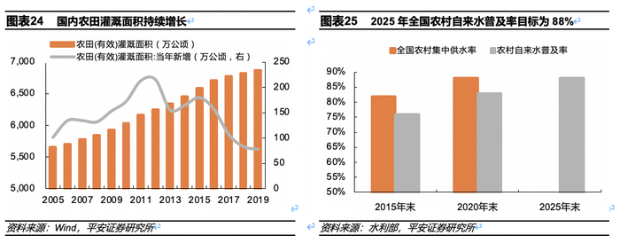 受益农田灌溉面积增长、供水工程建设,2008-2015年农用塑料管道规模显著增长。农用塑料管道主要为PE管、PVC管。2008-2015年国内农田有效灌溉面积从5847万公顷增至6587万公顷,灌溉面积增加叠加农业规模化、机械化普及与节水要求提高,带来大量塑料管道需求;同时政策积极解决农村饮水安全问题,《全国农村饮水安全工程“十二五”规划》提出,优先实施城镇供水管网向农村延伸,大力发展规模化集中供水和村村通自来水工程。据中塑协统计,2008-2015年农用(含供水与灌溉)塑料管道规模从78万吨增至400万吨,占国内塑料管道比重从17%提高至29%;另据智研咨询统计,2019年农用塑料管道规模升至435万吨,占比略微降至27%。