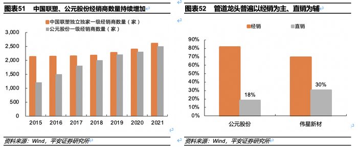 联塑等行业龙头纷纷大力拓展经销商,奠定渠道优势。目前塑料管道龙头企业普遍采取经销为主、直销为辅的销售模式,2015-2021年末中国联塑拥有的独立独家一级经销商数量从2130多家升至2603家;公元股份亦构建一张涵盖省地级中心城市,并辐射下属县城、乡镇的庞大经销网络,2014-2021年一级经销商数量从1100多家升至2500多家。由于渠道建设需要投入大量资金、以及较长的渠道和销售队伍建设周期,特别是建设全国性营销网络需要一套科学的组织结构、标准化的业务管理流程、完善的人才引进及培育体系,以实现营销管理、价格与质量管控、物流配送、库存等各个环节的精细化管理,联塑等行业龙头已奠定领先的渠道优势。
