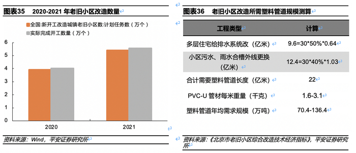 老旧小区改造加速,“十四五”年均塑料管道需求70万吨至136万吨。据住建部摸排结果,全国2000年以前建成的老旧小区近17万个、涉及居民上亿人、超4200万户、建面约40亿平。2020年4月住建部表示,需要改造的2000年以前建成的老旧小区约30亿平。2020年7月国务院办公厅印发《关于全面推进城镇老旧小区改造工作的指导意见》,要求到“十四五”期末力争基本完成2000年底前建成需改造城镇老旧小区改造任务。参考《北京市老旧小区综合改造技术经济指标》,塑料管道主要用于多层住宅给排水系统改造工程、小区污水外线更换工程和小区雨污合槽外线更换工程,三类旧改工程的管材单方消耗量分别为0.64米、1.03米和1.91米。假设改造的老旧小区均为多层住宅,多层住宅给排水系统改造比例为50%,小区污水外线更换比例为40%,若“十四五”完成30亿平米老旧小区改造,估算需要塑料管道22亿米。假设老旧小区改造均采用公称外径110mm-125mm、公称压力0.63-1.0Mpa的PVC-U管材,其1米重量为1.6-3.1千克,推算“十四五”期间老旧小区改造需要塑料管材352万吨至682万吨,年均70.4万吨至136.4万吨。