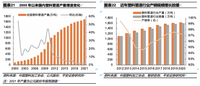 国内塑料管道行业由高速扩张期转入平稳发展期,近年产量保持微增。我国从20世纪60年代开始研制生产和应用PVC塑料管道,主要进行技术和设备的引进、消化、研究开发以及工程试点。1999年国家出台《关于加强技术创新,推进化学建材产业化的若干意见》,提出各种塑料管道的应用领域和发展目标,大力推进塑料管道在住宅建设、城镇市政工程、交通运输建设、农业灌溉等各领域的广泛应用,逐步淘汰能耗高、污染大的传统管道。政策支持叠加城镇化、工业化高速发展,2000-2013年国内塑料管道产量由78.6万吨升至1210万吨,历年增速保持10%以上。随着近年城镇化进程放缓,塑料管道行业进入平稳发展期,2018-2021年产量增速降至2%-3%。