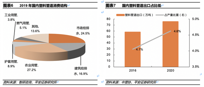 农用、市政及建筑给排水为塑料管道主要应用领域。塑料管道应用领域广泛,包括建筑给排水及采暖、市政给排水及采暖、农业给排水以及灌溉用管、电力通信护套管、工业排污管、燃气管道等,其中以农用、市政及建筑给排水为主。据智研咨询统计,2019年中国塑料管道消费结构中,市政给排水、建筑给排水、农业用管、护套用管、工业用管、燃气用管占比分别为24.5%、16.9%、27.2%、8.9%、3.8%、5.1%。另外国内塑料管道出口规模小,2020年塑料管道出口75.7万吨,占国内产量比重仅4.6%。