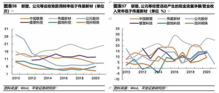 行业集中度较低,工程、零售龙头各有千秋。从竞争格局看,塑料管道行业集中度较低,TOP5销量市占率仅25%左右,呈现“一超多强”局面,中国联塑2020年市占率约16%,公元股份、伟星新材等不超过5%。其中,联塑、公元为工程市场龙头,受益地产集中度提升,以及公司自身渠道扩张、规模优势与资金实力,奠定行业领先地位。伟星则为家装零售市场龙头,零售市场盈利、现金流状况佳但客户分散、获客难,伟星通过“产品+服务”塑造品牌竞争力,树立高端管道典范,同时广铺营销网点、采取渠道扁平化策略,奠定营销优势。联塑、公元、伟星过去十年归母净利润CAGR分别为9%、8%、18%,过去五年CAGR分别为10%、22%、13%,三者均实现良好发展,其中伟星中长期表现更佳。