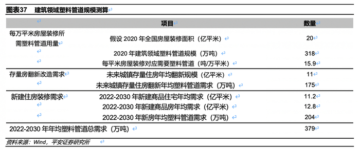 综上,存量房二次装修需求叠加新房需求维持高位,估算年均塑料管道合计需求约379万吨,高于2020年建筑领域塑料管道需求318万吨。需要注意的是,以上测算存在一定高估可能,主要因新房需求测算中超过一半来自存量房更新,这部分塑料管道需求与存量房二次装修带来的塑料管道需求存在重叠,因此真实需求或小于测算值。