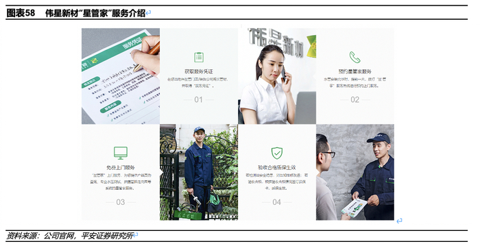伟星新材通过“产品+服务”塑造品牌竞争力,树立高端管道典范。伟星新材设立于1999年,是国内PPR管道行业的技术先驱,2012年公司在确立“优质高价”的品牌形象下,推出“星管家”特色增值服务,提升公司PPR管材竞争力,成为行业服务标杆,客户可免费预约“星管家”上门验收服务(跨地区、偏远地区除外),通过产品真伪查询、专业水压测试检查管道密封性、拍摄管路走向图、告知使用注意事项等系统服务,避免管道系统中存在的大部分隐患。