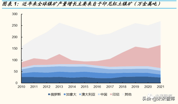由于硫化镍矿开采年限较长,易开采资源逐渐枯竭,当前以及未来镍 供应的增量主要来自于红土镍矿。