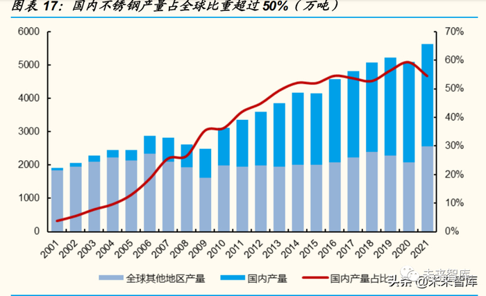 近年来全球不锈钢产量的增长主要来自于中国,当前国内产量占比已 超过 50%。21 年中国以外的地区产量也有明显提升,其增长主要来 自于印尼。据 Mysteel 数据,印尼产量从 20 年的 253 万吨增长至 21 年的 494 万吨,并将随着后续新产能的投产持续提升。