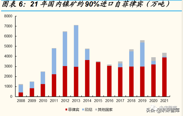 国内镍铁 NPI 生产严重依赖菲律宾矿石进口。国内镍铁生产所需原料依赖 于进口,镍矿主要进口自菲律宾和印尼。印尼对于镍矿出口政策的反复使 得历年来国内镍矿进口量有较大波动。自 20 年 1 月印尼镍矿出口禁令实 施以来,菲律宾成为镍矿主要进口来源,贡献约 90%进口量。菲律宾镍矿 进口量整体较为稳定,但品位呈下降趋势。据 Mysteel 数据,因高品位镍 矿资源的逐渐衰竭,市场可流通菲矿品位从 20 年以前的 1.5%以上降至 21 年的 1.2-1.4%。