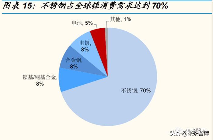 镍下游主要应用于不锈钢、电池、电镀、合金等领域,其中不锈钢为最大 应用领域,占比达到 70%,因其对镍用量基数较大,未来仍将作为拉动镍 需求增长的重要驱动力;受益于新能源汽车产销量爆发式增长,镍下游需 求中电池用镍需求增速最快,其在总需求中占比预计将持续提升。