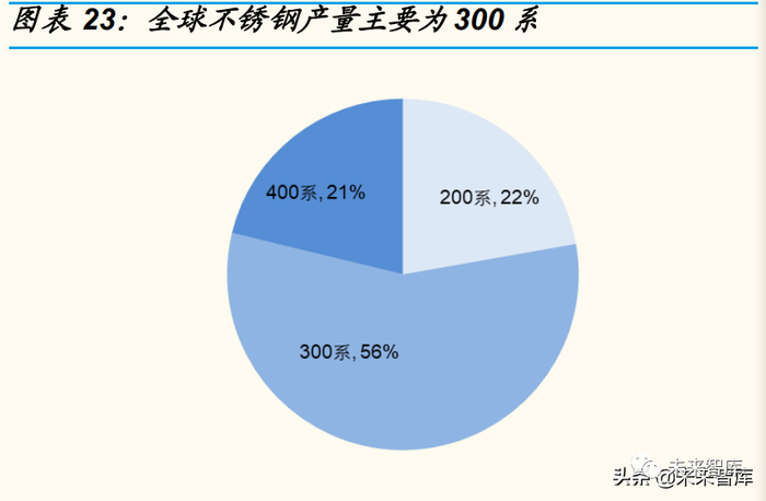 高镍 300 系对 200 系不锈钢形成部分替代。21 年全球 200/300/400 系不 锈钢产量占比分别为 22%/56%/21%。由于 200 系产能主要集中在国内, 国内 200 系占比达到 30%,但近年来其占比有所下滑。据 Mysteel 数据, 21 年国内不锈钢产量 3245 万吨,同比+8.7%,其中 200 系/300 系/400 系 增速分别为 1.8%/11.0%/14.9%。随着 300 系产能的持续放量以及下游需 求升级,300 系对 200 系的生产及需求形成了一定的挤压。而 400 系应用 相对独立,较少受到 300 系的冲击。