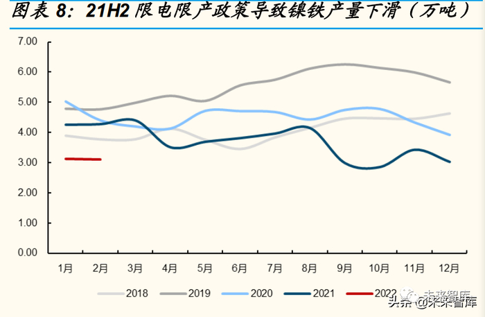 原料供应限制国内镍铁产量提升。20 年国内镍铁产量 54 万吨,受制于矿 石原料不足,同比-18%;21 年产量 44 万吨,同比-18%,主要系能耗双 控政策导致下半年部分地区限电限产;22Q1 产量受冬奥会影响依然保持 在低位,预计后续将环比回升:对比历史镍铁价格与产量可以发现,两者 具备较强相关性(除受到原料不足及限产等外部制约的情况外),在当前 镍价高企的背景下国内镍铁厂有较强动力满产。但考虑到总产量仍受制于 镍矿供应天花板,预计 22-23 年国内镍铁产量分别为 43/42 万吨。