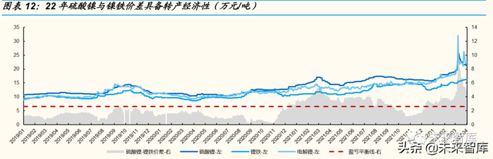 镍铁-高冰镍是否转产取决于经济效益。镍铁转产高冰镍工艺路线并不复杂, 仅需在产出镍铁的基础上增加转炉硫化及吹炼设备,而是否转产取决于是 否具备经济性。镍铁制备高冰镍需要 1000 美元/吨镍,高冰镍酸溶需要 3000 美元/吨镍,对应镍铁-硫酸镍成本为 4000 美元,仅当硫酸镍与镍铁 的价差能够覆盖生产成本时,转产才具备经济性。