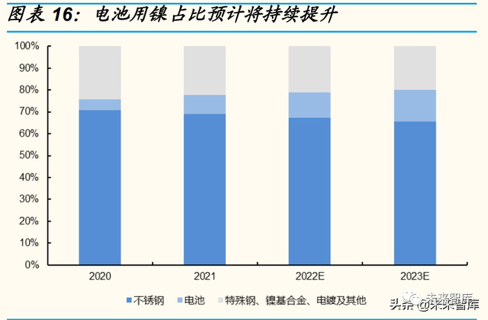 考虑到新增产能主要来自于 300 系以及近年来 300 系对 200 系的替代 趋势,预计增量的 80%来自于 300 系,20%来自于 400 系。测算得 22-23 年不锈钢领域带来镍需求增量 13/14 万吨。