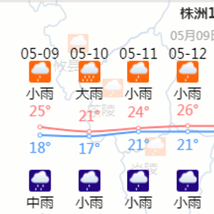 5月9日晚至10日白天:暴雨,攸县局地大暴兩,北风2—3级,气温 19~22°C。