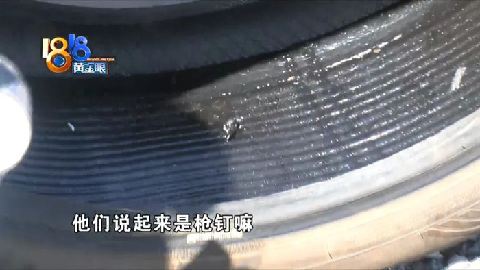 骆先生:“老板他说这个轮胎肯定是补过的,因为我当时我也不相信,因为一个新车怎么可能补过,对不对?(具体什么依据?)依据的话,因为这上面有螺丝钉,这一个,然后这一个,这两个。(这个是什么东西?)他们说起来是枪钉嘛,枪钉打好以后,补过以后遗留下来的。”