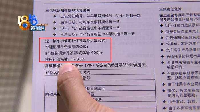 汽车三保凭证中写了关于“退换车的使用补偿系数及计算公式,根据这个公式计算,如果走退车流程,胡先生需要承担超过1万6千元车辆使用补偿。他表示不能接受。