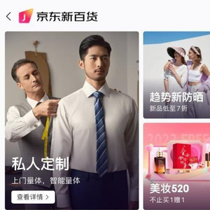 点击进图“京东新百货”频道可以看到,“私人订制”“定制服务”“520限定”“美好生活季”等关键词,这似乎道明了这项新业务精品买手集合店的定位。京东方面提到,新百货频道对入选商品设置严格的准入、流转和识别标准,入选商品均有专属“京东新百货”标签。