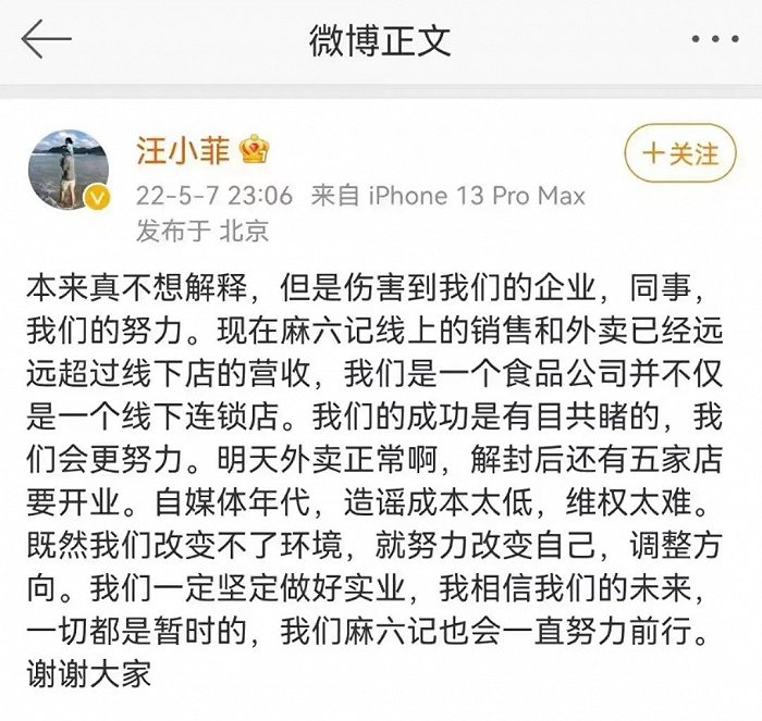 5月7日,汪小菲亲自下场,公开辟谣。在微博中表示:现在麻六记的线上销售和外卖,已经远超线下店营收,我们是一个食品公司,而非线下连锁餐饮店。