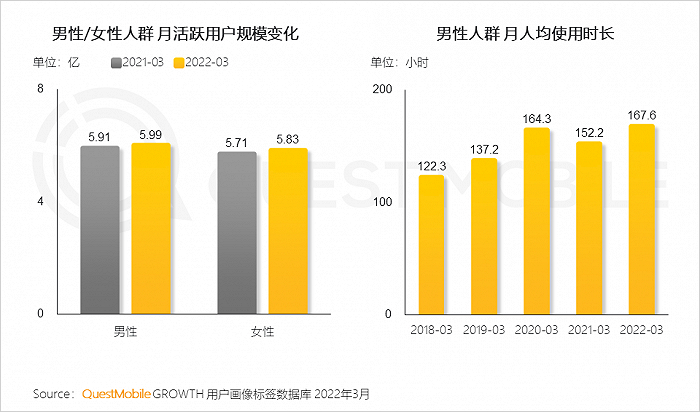 QuestMobile数据显示,男性和女性用户整体均保持增长,其中男性用户规模接近6亿,月人均使用时长达到167.6小时,近5年复合增长8.2%。