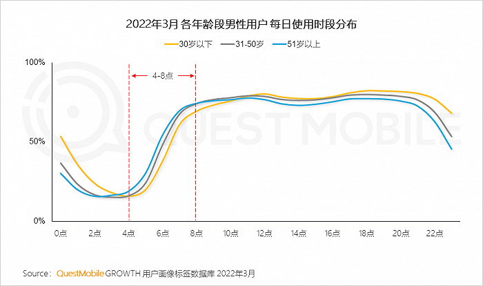 4、不同年龄男性群体每天活跃时段较为相似,“熬夜党”多为年轻人群,清晨时段51岁以上用户相对更为活跃