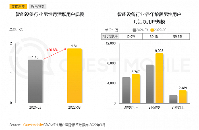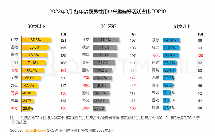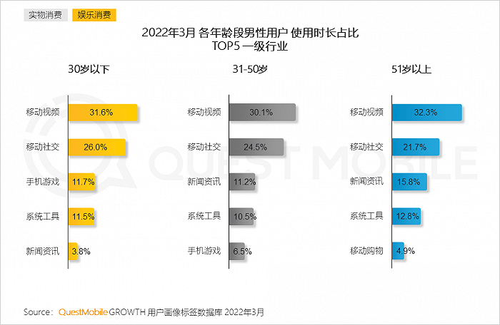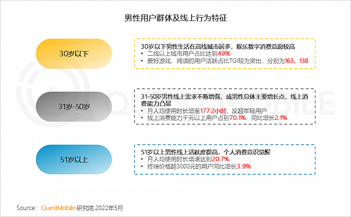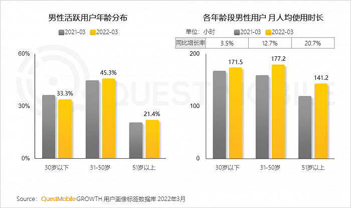 QuestMobile数据显示,男性使用时长增长主要由31-50岁男性带动,其月人均使用时长达到177.2小时,同比增长12.7%。