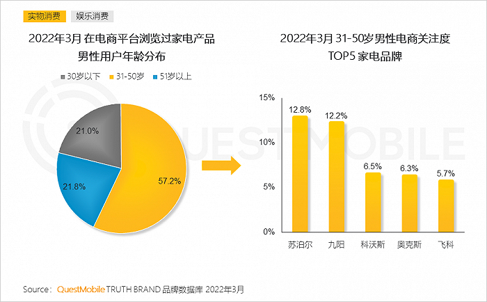 6、作为家电消费中男性用户的购买主力,31-50岁群体对家电产品的关注度最高,生活小家电、智能电器的热门国产大牌为其主要关注产品