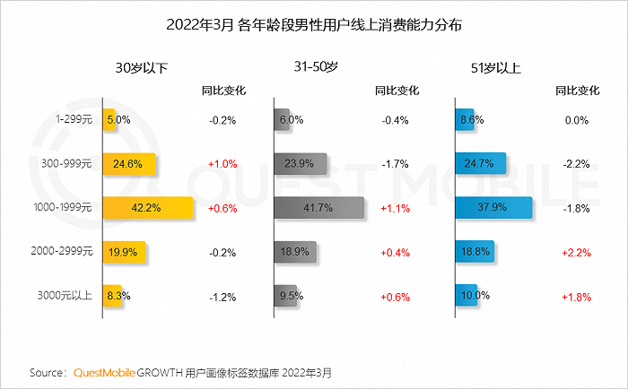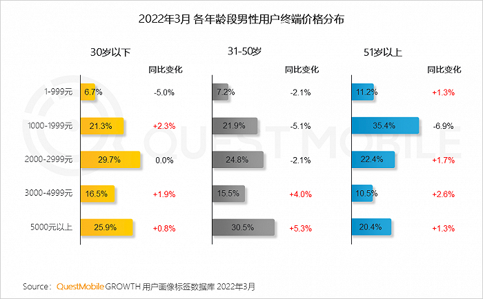 QuestMobile数据显示, 31-50岁男性群体3000元以上终端使用比例最高,占比达到46.0%,同比增长9.3%。