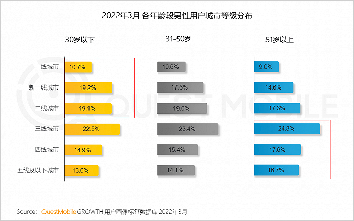 3、30岁以下用户在一二线城市的占比相对较高,随年龄段增长,用户分布逐渐向下沉市场倾斜
