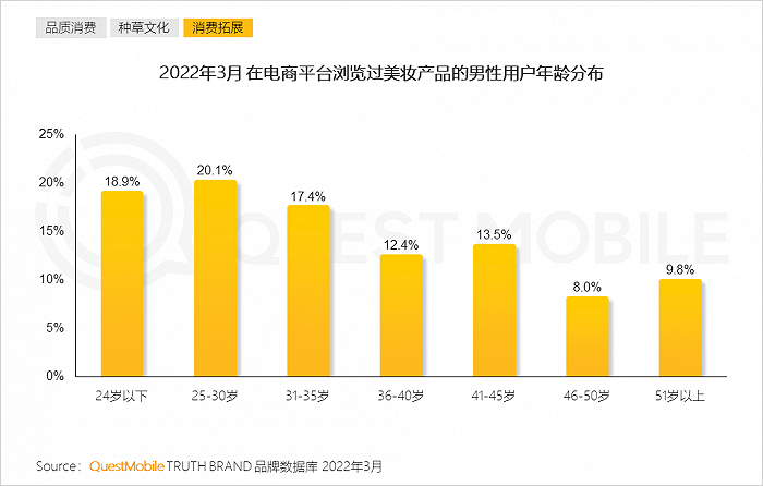 7、男性群体对于美妆消费关注愈发普及化,其中80、90后依然是主要关注群体,51岁以上年长用户亦展示出对美妆的兴趣