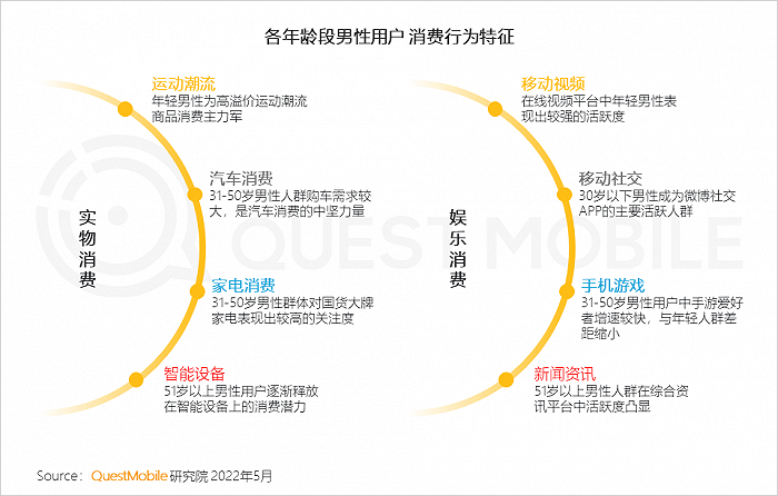 1、年轻男性用户是运动潮流、手机游戏的主要受众群体,31-50岁男性是家电、汽车等大件消费的主力军,51岁以上人群对潮流事物接受度增强