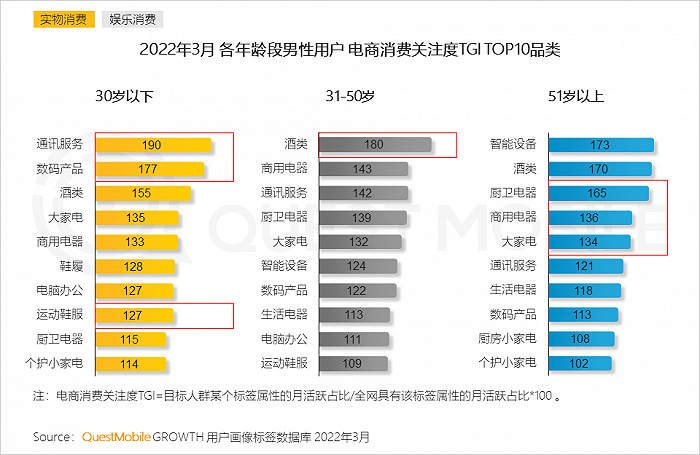 2、男性用户倾向3C数码、酒类、电器等客单价较高的产品,31-50岁男性展现出在酒类商品中突出的消费需求,各类家电产品更受到51岁以上群体的关注