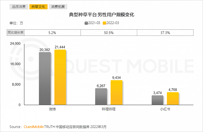 4、男性相关话题成为种草平台新的“流量密码”,各典型平台男性用户规模均快速增长,男性消费受KOL的影响日益加深,为品牌的多元化营销带来可能