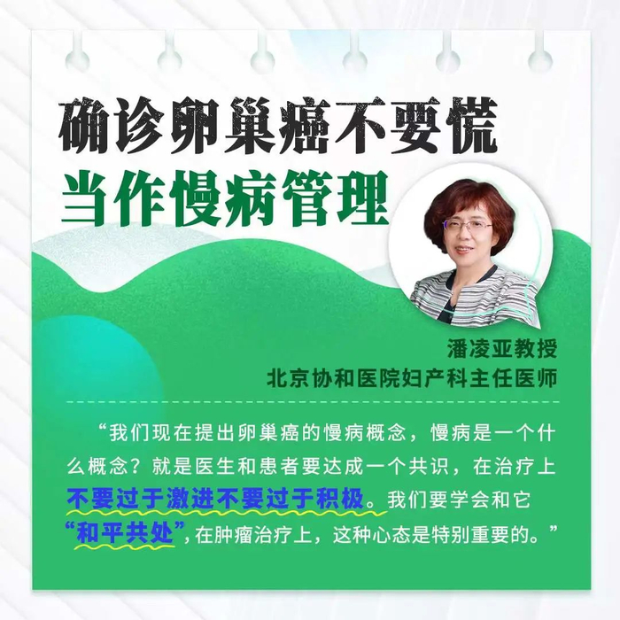 如今,卵巢癌的治疗已经进入了慢病化管理时代。“我们现在提出卵巢癌的慢病管理观念,就是医生和患者要达成共识,在治疗上不要过于激进,要学会和它和平共处,在肿瘤治疗上这种心态特别重要。”北京协和医院妇产科主任医师潘凌亚教授强调,“抗癌之路是一场持久战,要做好长期作战的准备。正确看待疾病,并且慎重地迈出第一步,选择一个正确的医院、正确的医生、正确的治疗办法,这是卵巢癌新患者们要做的第一件事。在今后抗癌的过程中,要和家人一起,用不竭的勇气、智慧和耐心来彼此照顾,一同坚持下去。”