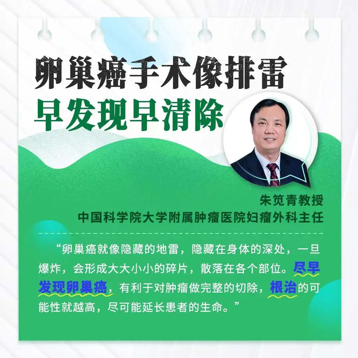 吴鸣教授指出:“尽管卵巢癌是妇科肿瘤中死亡率最高、预后最差的疾病,但早期卵巢癌90%以上可以治好,而晚期卵巢癌也不乏长期生存的病例,如果接受正规治疗,50%以上能活过5年。”