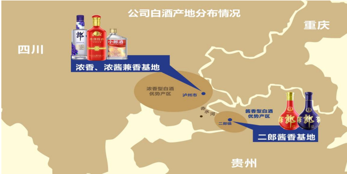 “郎”酒品牌因地成名,公司酱香白酒生产基地位于四川省古蔺县二郎镇。二郎镇地处赤水河畔,属于“中国白酒金三角(川酒)”酱香型白酒优势产区;公司生产的酱香型白酒以其独特香型和风味受到消费者的青睐。“郎”牌酱香型白酒先后于 1984 年、1989 年连续两度在全国评酒会获评“国家名酒”称号,奠定了“郎”牌白酒在全国白酒行业中的重要地位。除酱香型白酒产品外,公司在四川省泸州市龙马潭区还有浓香、浓酱兼香白酒生产基地,公司不断优化浓香型白酒的酿造工艺,以提升所产浓香型白酒的产品品质。公司提出了浓酱兼香型白酒“两步法”生产技术,所生产的浓酱兼香型白酒具有“浓中带酱”的独特风味和口感。