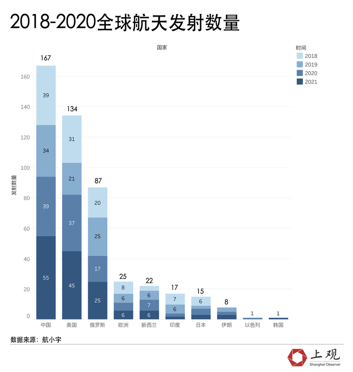 2021年全球共发射146次,其中中国发射55次,占全球发射总数的37.7%,位居世界第一;