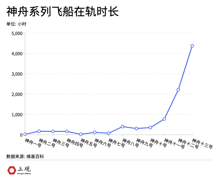 从神舟一号到神舟十三号,神舟系飞船在轨时长约翻208倍,其中神舟一号在轨时长最短,为21小时11分;而神舟十三号执在轨时长最长,为182天9小时32分。