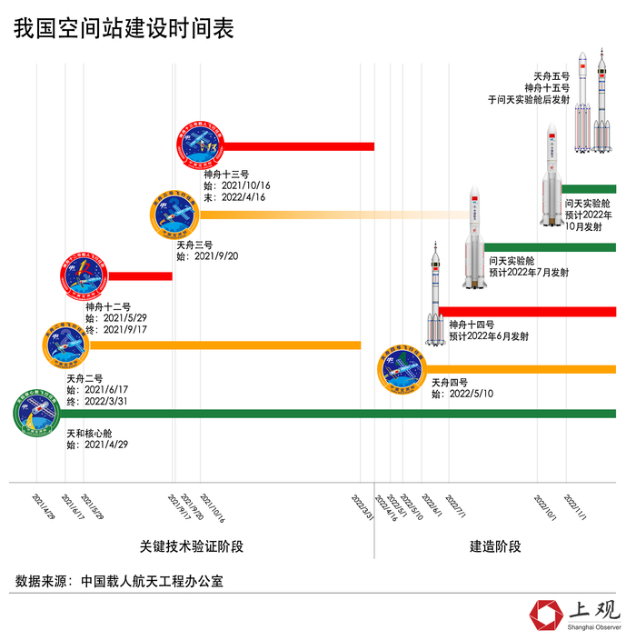 神舟十三号飞行任务取得成功,标志着中国空间站关键技术验证阶段圆满完成,而天舟四号的成功发射,则开启了建造阶段。在4月17日国新办举行的中国空间站建造进展情况新闻发布会上,中国载人航天工程办公室主任郝淳说: “自2020年以来,我国成功实施了长征五号b运载火箭首飞,空间站天和核心舱,神舟十二号、神舟十三号载人飞船,天舟二号、天舟三号货运飞船共6次飞行任务,圆满完成了关键技术验证阶段的任务目标。”