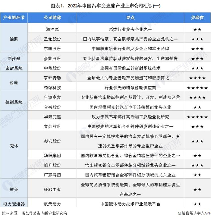 汽车变速箱,是一套用于来协调发动机的转速和车轮的实际行驶速度的变速装置,用于发挥发动机的最佳性能。目前,我国汽车变速箱产业各环节的上市公司数量较多,具体包括: