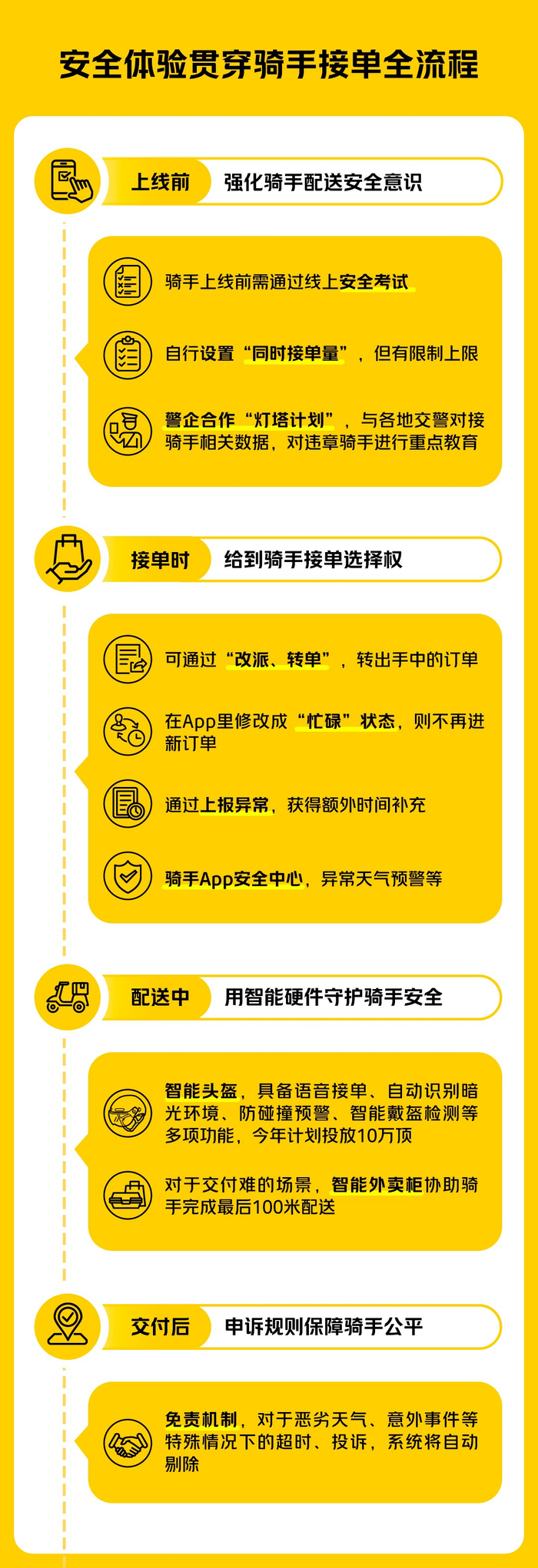 美团外卖称,经骑手恳谈会、算法交流会等方式发现,骑手安全问题与配送途中异常场景的发生有强关联。为解决异常场景问题,平台推出系列举措:一是减少订单可能的异常,对于预判和识别到的异常场景,提供“单次补时+系统修正”两种方式,让订单的配送时间更合理;二是应对骑手可能的异常,骑手可通过改派、转单、自行设置“同时接单量”等方式,管理自己的接单节奏。