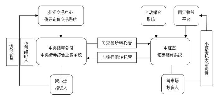 2005年中央结算公司与中国外汇交易中心联网,为银行间债券市场提供交易数据直通处理服务。交易成员在交易系统上的成交数据会实时传输至中央结算公司的中债综合业务系统,之后由中债综合业务系统按该数据生成交易双方待确认的结算指令,交由成员通过客户端进行确认,中债综合业务系统根据结算双方人员确认后的指令办理结算。