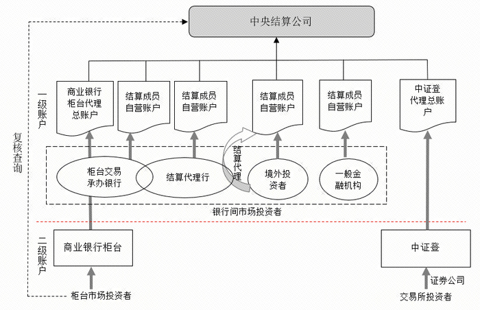 3. 商业银行柜台。是银行间市场的延伸,也属于零售市场。柜台市场实行两级托管体制,其中中央结算公司为一级托管机构,负责为开办银行开立债券自营账户和代理总账户,开办银行为二级托管机构,负责为投资者开立二级托管账户,中央结算公司与柜台投资者没有直接的权责关系。与交易所不同的是,开办银行每日需将柜台投资者账户余额变动数据传给中央结算公司,同时中央结算公司为柜台投资人提供债券复核查询服务,成为保护投资者权益的重要途径。