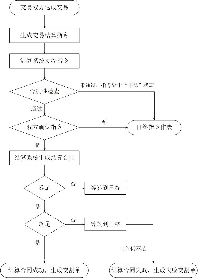 在结算日系统运行时间内,因指定券种数额暂时不足,或款项暂时未足额到账而未能成功办理结算的结算合同,系统将其放入等待队列,在结算日日终前若相关条件具备后,系统将再次启动该笔结算的处理流程。在结算日日终券或款项仍不足的结算合同,系统通知相关结算成员结算失败,生成失败交割单,作为交易结算最终依据。