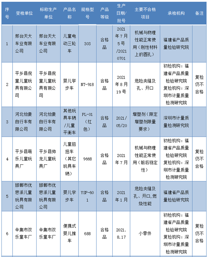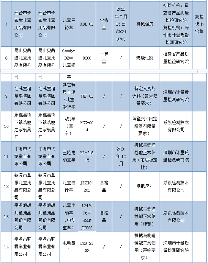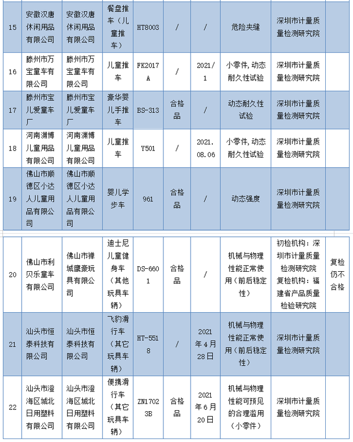 不合格项目涉及闸把尺寸,机械强度,小零件,动态耐久性试验,危险夹缝及孔、开口,动态强度,前后稳定性,刚性材料上的圆孔,弹簧,声响要求等10个机械与物理性能项目,以及燃烧性能、特定元素的迁移、增塑剂。