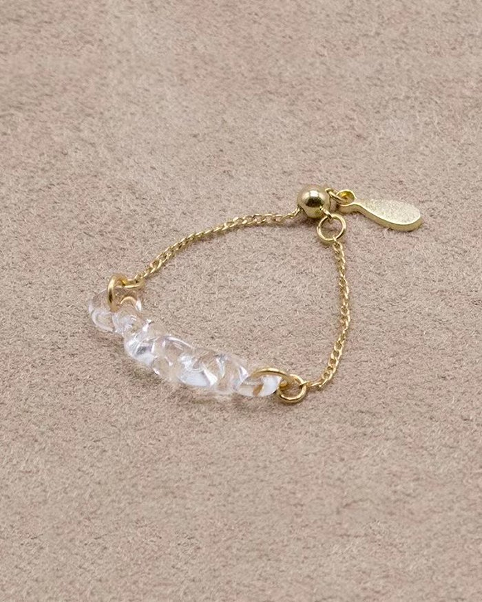 与形状各异的透明造型搭配的是金色或银色链条,佩戴效果如水滴点缀着耳部,颈部与腕间,能为细微处增添美丽光泽。况且夏日炎炎,该系列饰品本身自带凉爽,与轻薄衣物相衬可谓是最佳拍档。