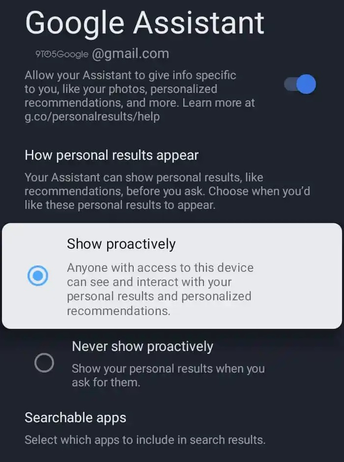 在设备上启用后,你会看到这样一个菜单提醒,告知“主动式个性化搜索功能已开启”,以便用户跳转到 Google Assistant 设置页面。若不需要,亦可随时将之关闭。