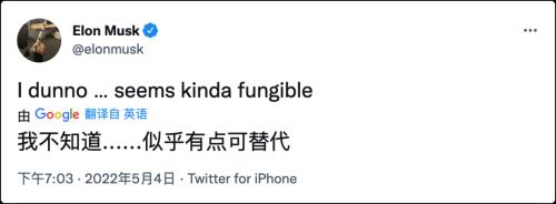 同时,马斯克发了一条推特,拿NFT的不可替代特性开启了玩笑,称:“我不知道……这似乎有点可替代”。不久之后,马斯克便更换了头像。