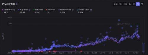 据 NFTGo.io 数据显示,4月27日,无聊猿NFT地板价(即市场最低价)则触及147 ETH(约合42万美元),创历史新高。和刚上线时0.08 ETH的售价相比,短短一年的时间,价格翻了1837倍。