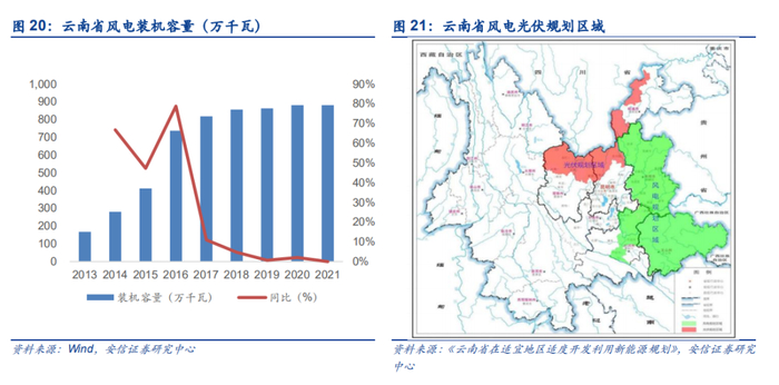 云南风资源储量丰富,可开发前景广阔。云南省风电装机从 2015 年开始进入快速增长期,截至 2021 年底,云南省风电总装机容量为 8.81GW,2015-2017 年为云南省风电投产高峰。根据《云南风电资源开发现状及特点浅谈》,云南全省风能资源储量为 1.23 亿千瓦,风资源可开发面积约为 4.52 万立方千米,占全省面积的约 11.5%,其中可开发风资源储量为 28.32GW。虽然近两年云南省风电投产进度有所下滑,但未来仍有较大开发前景。根据云南省于 2020 年发布的《云南省在适宜地区适度开发利用新能源规划》,云南省划分了适宜开发光伏、风电的规划区域,包括昆明、曲靖、昭通、文山等六个州(市),集群优势与规模效应有望进一步凸显。