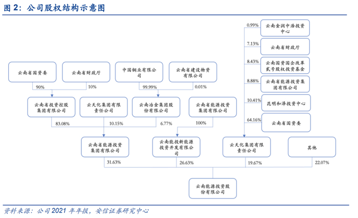 公司控股股东为云南省能源投资集团,实际控制人为云南省人民政府国有资产监督管理委员会。截至 2021 年底,集团直接持有公司 31.63%的股权,并通过云南能投新能源投资开发有限公司和云天化集团有限责任公司间接持有公司 28.4%的股权。
