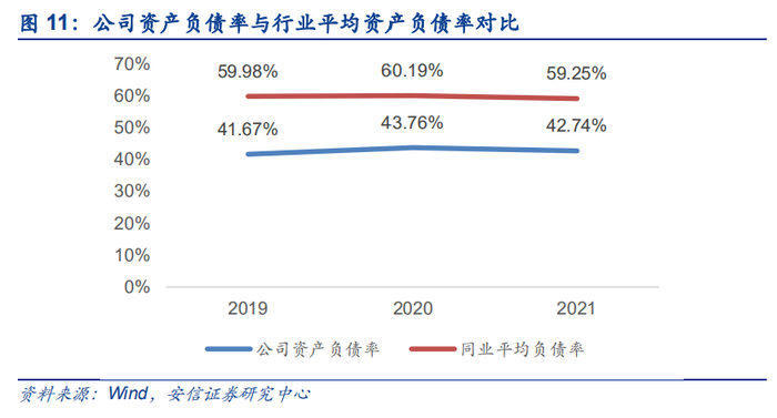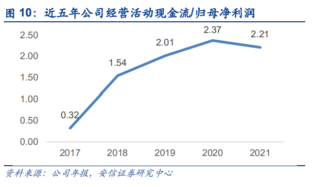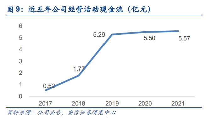 公司现金流稳步提升,资产负债率低于行业平均。近年来公司经营活动现金流稳步增长,从 2017 年的 0.52 亿元增至 2021 年的 5.57 亿元,近三年经营现金流与净利润比维持在 2.2左右,资产负债率维持在 42%左右,低于行业平均,为公司向新能源板块业绩转型提供源动力。